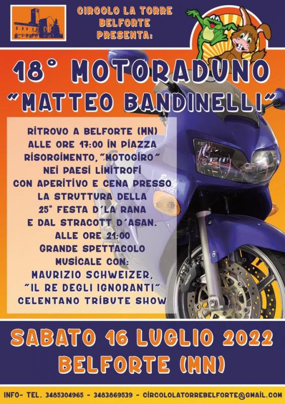 Sabato 16 luglio, inizierà e si svolgerà al pomeriggio il 18º Motoraduno "MATTEO BANDINELLI" a Belforte (MN).