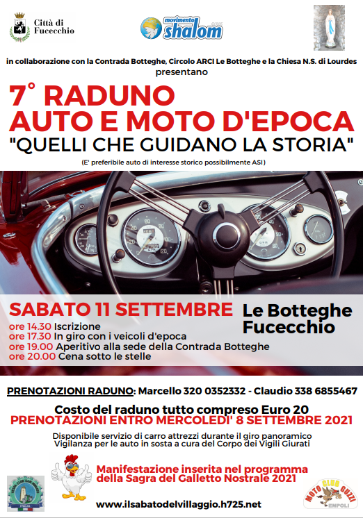 Il Movimento Shalom, in collaborazione con la Contrada Botteghe, il circolo Arci Le Botteghe, la chiesa N.S. di Lourdes e con il patrocinio del Comune di Fucecchio, organizza il 7° Raduno auto e moto d'epoca, manifestazione inserita all'interno della Sagra del galletto nostrale.