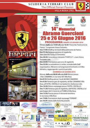 Partirà da Tortoreto il 14° raduno Ferrari – memorial “Abramo Guercioni” – Trofeo Scuderia Ferrari Club Villa Rosa-Martinsicuro. Anche quest’anno il club ferrarista si è piazzato al 15° posto sulla graduatoria internazionale per numero di iscritti – come dichiara il Presidente Dino Natali – un motivo in più per promuovere il territorio teramano e ricordare il compianto Abramo Guercioni, amico del club e grande appassionato di auto. La manifestazione è di fatto di carattere interregionale, visto che gli equipaggi arriveranno dal vicino Molise, Lazio, Umbria, Marche e Abruzzo. Quest’anno, grazie all’interessamento del consigliere del club e responsabile organizzativo dell’evento, Gabriele Barcaroli, si svolgeranno tre percorsi di regolarità tra Tortoreto, Giulianova, Alba Adriatica e Martinsicuro; percorsi pianificati sotto la super visione del suo staff dell’autoscuola San Flaviano e studio investigativo Gamma che cureranno il regolare svolgimento della manifestazione. Particolare toccante di questa edizione sarà il ricordo di Abramo Guercioni, grande appassionato di auto e ben rappresentato da suo figlio, Riccardo Guercioni, Vicepresidente del club Ferrari il quale dedicherà questi due giorni anche al compianto imprenditore informatico Paolo Cialini (il giuliese ucciso per una banale discussione in strada tra automobilisti) suo amico personale e collega di lavoro.