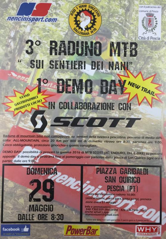 Domenica 29 maggio dalle ore 8.30 si terrà il 3° raduno MTB "Sui sentieri dei nani", 1° demo day. Il raduno di mountain bike non è competitivoe seguirà un percorso di media difficoltà sui sentieri della svizzera pesciatina. Ritrovo ore 8.30 con partenza alle ore 9.00. Casco obbligatorio, protezioni ginocchia e gomiti consigliate. Ritrovo in Piazza Garibaldi, San Quirico (Pescia). Quota di partecipazione 10.00 € (assicurazione, pacco gara e pasta party). Penotazioni entro venerdì 27 maggio.