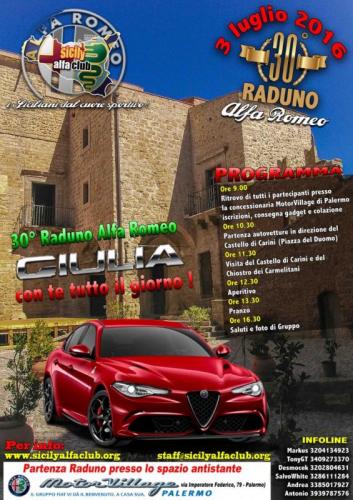 Il 3 Luglio 2016 si svolgerà il 30° raduno Alfa Romeo organizzato dal Club alfista siciliano Sicily Alfa Club, con la collaborazione della concessionaria MotorVillage di Palermo. La manifestazione è dedicata alle vetture storiche e moderne del glorioso marchio del Biscione, la regina della giornata sarà la nuova Alfa Romeo Giulia, che accompagnerà i partecipanti lungo tutto il percorso della manifestazione. Lo start della manifestazione sarà dato alle ore 9.00 presso i locali della Motorvillage Palermo in via Imperatore Federico, gli alfisti si muoveranno in direzione di Carini per visitare il Castello e termineranno la giornata con il Pranzo nella caratteristica citta di Terrasini.