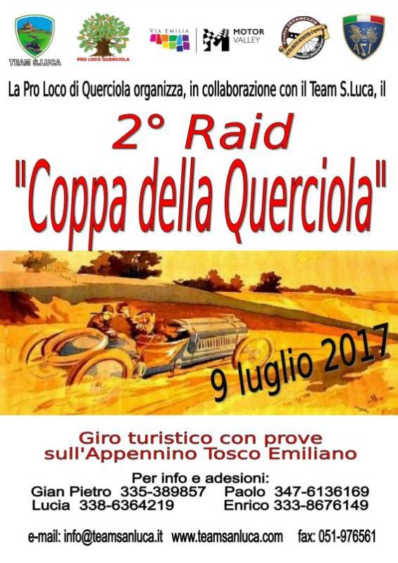 La Pro Loco di Querciola ed il Team S.Luca vi invitano il 9 luglio 2017 a partecipare al 2° Raid "Coppa della Querciola", giro turistico per auto d'epoca con prove sull'Appennino Tosco Emiliano. Una imperdibile occasione per fuggire dalla calura estiva a bordo delle nostre amate auto d'epoca e gustare le specialità tipiche della zona. Contributi: iscrizione 25 Euro a equipaggio - pranzo 25 Euro a persona.