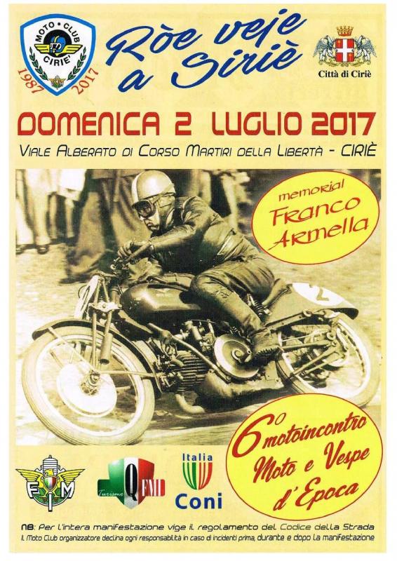 Domenica 2 luglio 2017 in Viale Martiri della Libertà si svolgerà il 6° motoincontro “Moto e Vespe d’Epoca” – Memorial Franco Armella, promosso dal Moto Club Cirié e patrocinato dal Comune.