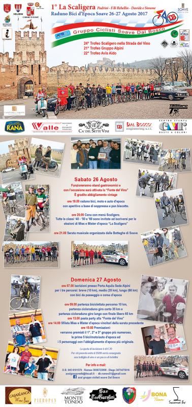 Il Gruppo Ciclisti Soave “Dal Bosco” organizza il 1° Raduno Bici d’Epoca “La Scaligera” - Padrini - F.lli Rebellin - Davide e Simone, che si svolgerà nel centro storico, lungo via Roma, del borgo medioevale di Soave (Vr) nei giorni di sabato 26 e domenica 27 agosto 2017. In concomitanza si terranno anche il 24° Trofeo Scaligero nella Strada del Vino, il 21° Trofeo Gruppo Alpini Soave ed il 22° Trofeo Avis Aido.