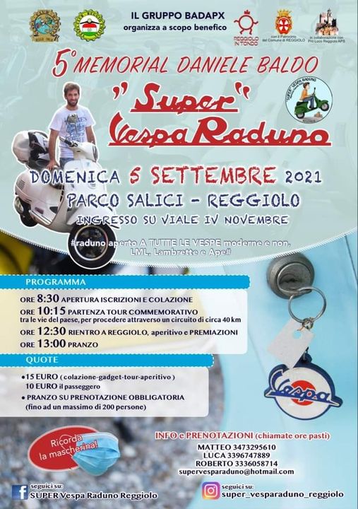 Al via il 5° Super Vespa Raduno di Reggiolo, a scopo benefico, in memoria del nostro caro amico Daniele Baldo. L’evento si terrà DOMENICA 5 SETTEMBRE 2021 a Reggiolo al Parco Salici, quindi segnatevi la data, vietato mancare!