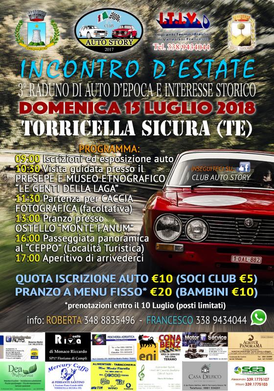 Domenica 15 Luglio, dalle ore 09:00 presso le due piazze principali di Torricella Sicura (TE), avrà luogo il 3° Raduno di Auto d’epoca e di interesse storico denominato “INCONTRO D’ESTATE”, una giornata all’insegna dell’amicizia e della condivisione della stessa passione.
