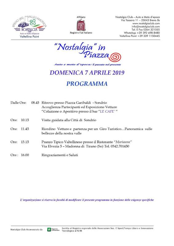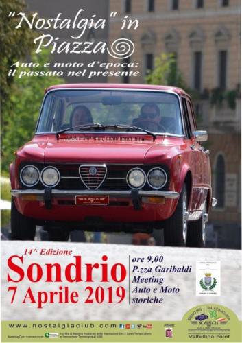 Il Valtellina Point del Nostalgia Club Auto e Moto d'Epoca è lieto di annunciare data e programma della quattordicesima edizione dell'evento Nostalgia in Piazza, che si terrà a Sondrio, domenica 7 aprile 2019.