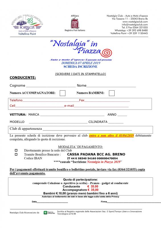 Il Nostalgia Club è un'associazione ufficialmente riconosciuta dalla Regione Lombardia e pertanto iscritta al Registro regionale delle Associazioni Sez. E Sport/Tempo Libero e Innovazione Tecnologica al N.98. Il club è affiliato al Registro Fiat Italiano (per informazioni contattare la segreteria Nostalgia).