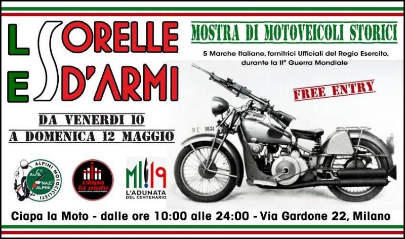 L’Ass.ne ALPINI MOTOCICLISTI organizza a Milano nel magico e suggestivo contesto Bikers dei locali di Ciapa la Moto - MotoSplash, Via Gardone 22, Milano gratuitamente concessi per l’occasione, una Mostra di Motoveicoli Storici unica nel suo genere, delle 5 Marche Italiane, fornitrici Ufficiali del Regio Esercito, di motoveicoli militari con caratteristiche tecniche unificate, per uso bellico durante gli anni della Seconda Guerra Mondiale (1940-1945).