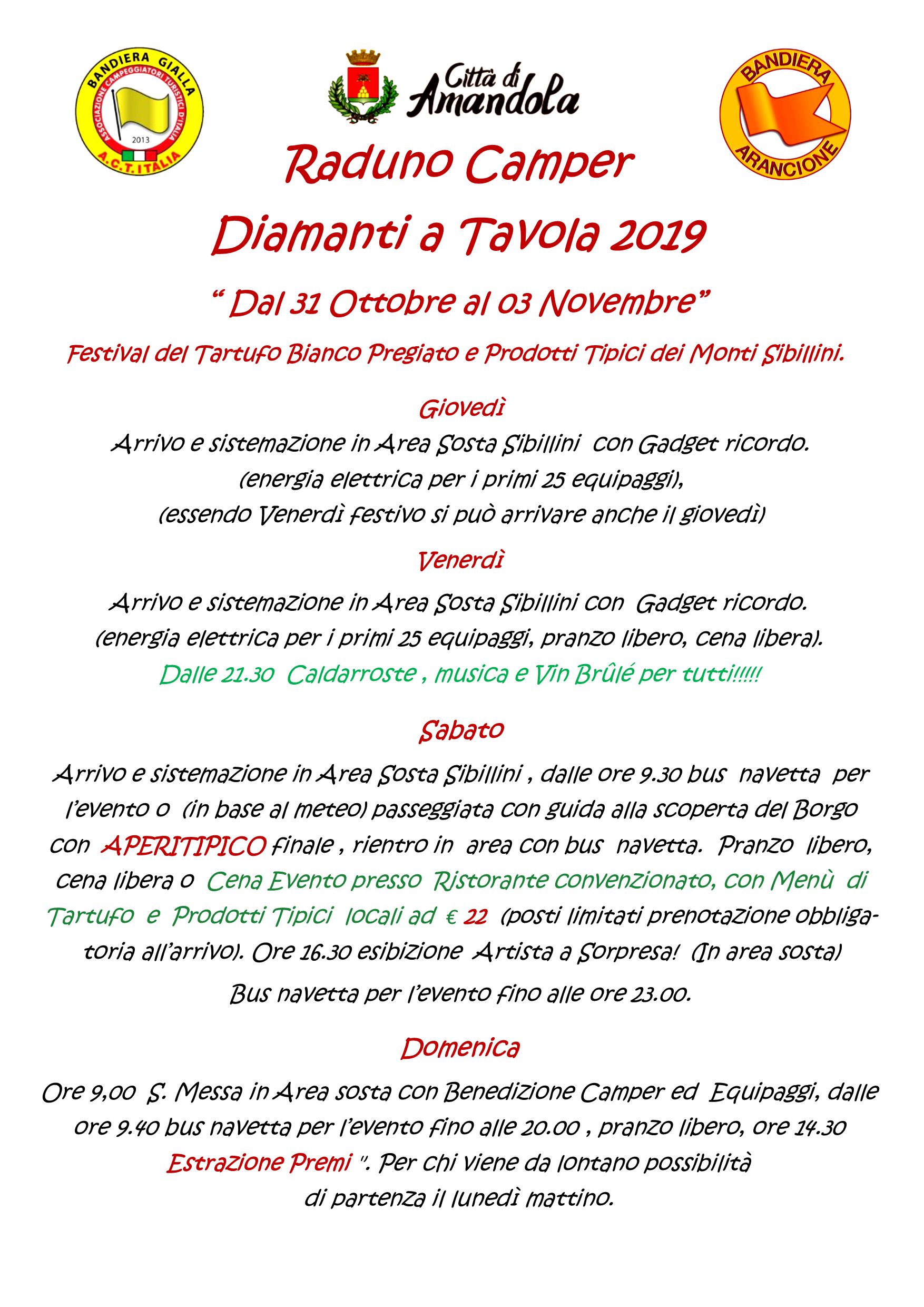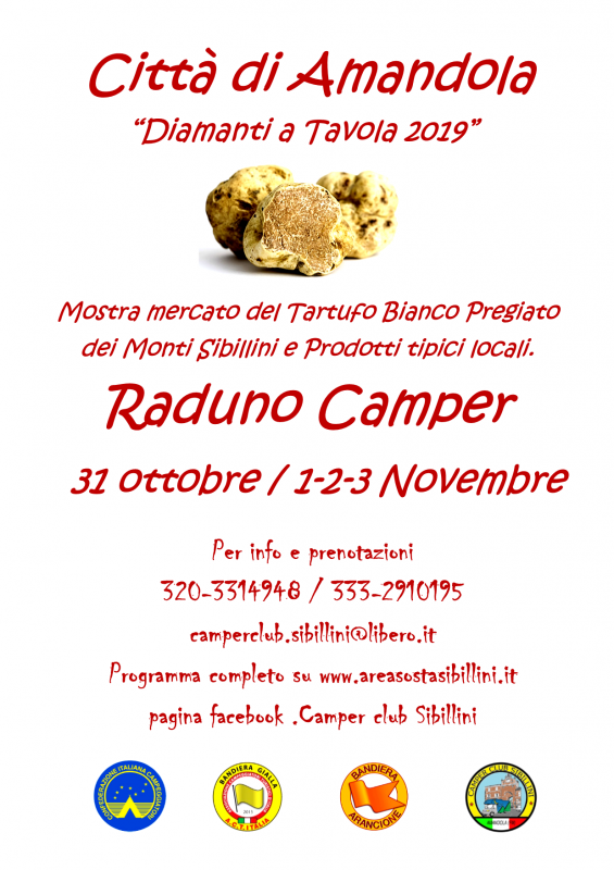 Come ogni anno nel primo e secondo weekend di novembre nella cittadina di Amandola si festeggia il pregiatissimo Tartufo Bianco dei Monti Sibillini, il Camper club Sibillini vi invita allo storico Raduno Camper che si terrà come sempre nella pluripremiata area sosta Sibillini da giovedì 31 ottobre a domenica 03 Novembre.