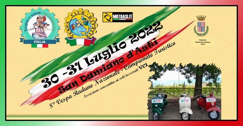 A San Damiano d'Asti in provincia di Asti si svolge nei giorni Sabato 30 e Domenica 31 Luglio 2022 la 8a edizione del Vespa Raduno Nazionale.
