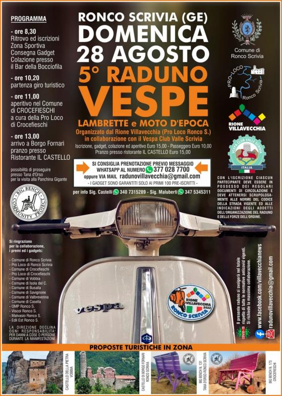 A Ronco Scrivia in provincia di Genova si svolge nella giornata di Domenica 28 Agosto 2022 la 5a edizione del Raduno Vespe, Lambrette e Moto d'Epoca.