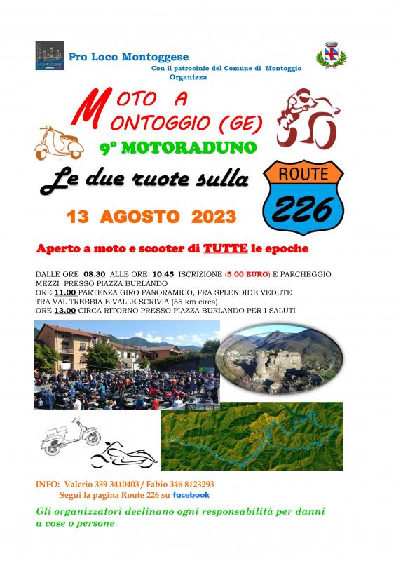 13 Agosto 2023 Motoraduno aperto a tutte le due ruote, nel verde delle nostre colline, un percorso fra mitiche strade come la strada provinciale 226, attraversata quest'anno dal Giro d'Italia,la statale 45 ben nota ai motociclisti ed un passaggio sopra la diga del Brugneto