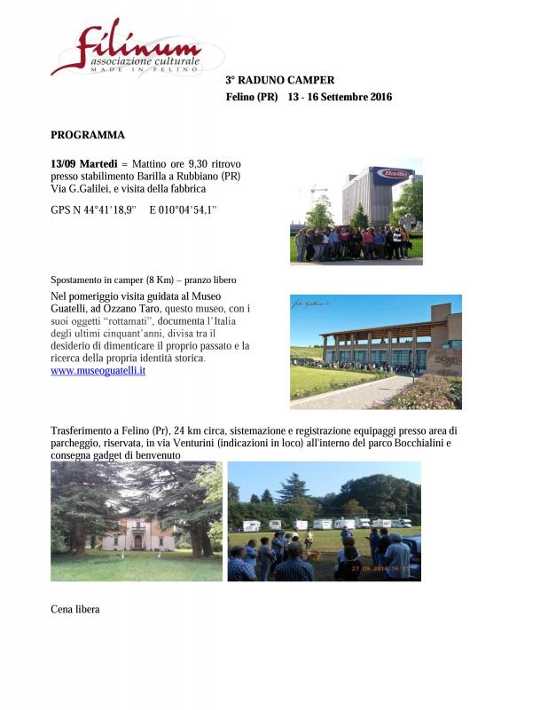 Raduno camper alla scoperta del territorio e dei suoi prodotti a Felino (pr) dal 13 al 16 Settembre 2016.