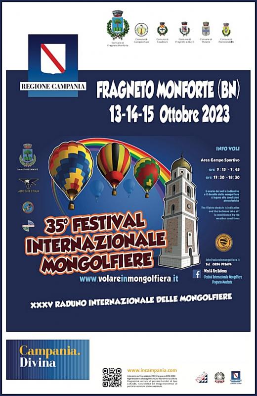 La 35a edizione del Raduno/Festival Internazionale Mongolfiere a Fragneto Monforte (BN) si svolge dal 13 al 15 Ottobre 2023.