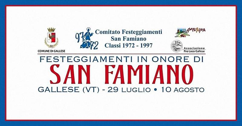 La Festa di San Famiano è la celebrazione in onore del Patrono dell’antica Città di Gallese ed è uno degli eventi più suggestivi della Tuscia. La ricorrenza si terrà dal 29 Luglio al 10 Agosto ed è stata riconosciuta come Manifestazione tradizionale di interesse regionale in quanto rievoca storia e usanze molto antiche.