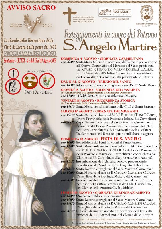 Il Santuario Diocesano di Sant'Angelo in Licata (AG), unitamente alla Forania di Licata e al Terz'Ordine Carmelitano di Licata rendono noto il programma dei festeggiamenti in onore del Santo Patrono Sant'Angelo Martire che si terranno nel Santuario il 4 e dal 15 al 19 Agosto 2019. Nel contesto dell'anno in preparazione all'Ottavo Centenario del Martirio del Santo, che verrà celebrato dal prossimo 5 Maggio 2020, le celebrazioni quest'anno verranno aperte con la presenza del Priore Generale dell'Ordine Carmelitano, in visita a Licata domenica 4 Agosto. I Padri Carmelitani animeranno anche per il resto delle celebrazioni che vadranno la presenza del Priore Provinciale della Provincia Italiana dei Carmelitani ed una delegazione di Carmelitani provenienti da diverse località d'Italia e dell'isola di Malta.