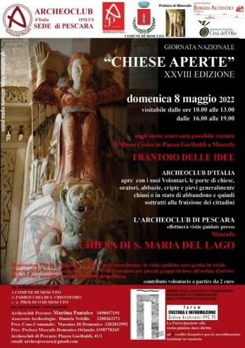 Anche quest'anno la sede di Pescara, in collaborazione con la locale pro - loco, terrà aperta con proprie guide Santa Maria del Lago di Moscufo. Contestualmente sarà anche visitabile il museo " Il Frantoio Delle Idee" sito nel centro storico.