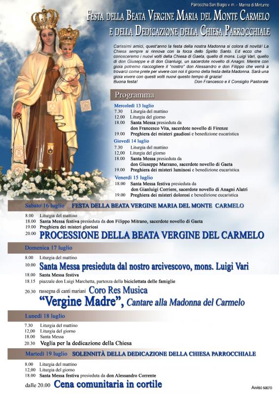 Come ogni anno nel cuore dell’estate dal 13 al 19 luglio la comunità parrocchiale di San Biagio di Marina di Minturno si ritrova per celebrare la Beata Vergine del Monte Carmelo (il 16 luglio) e ricordare la dedicazione della Chiesa parrocchiale (il 19 luglio).