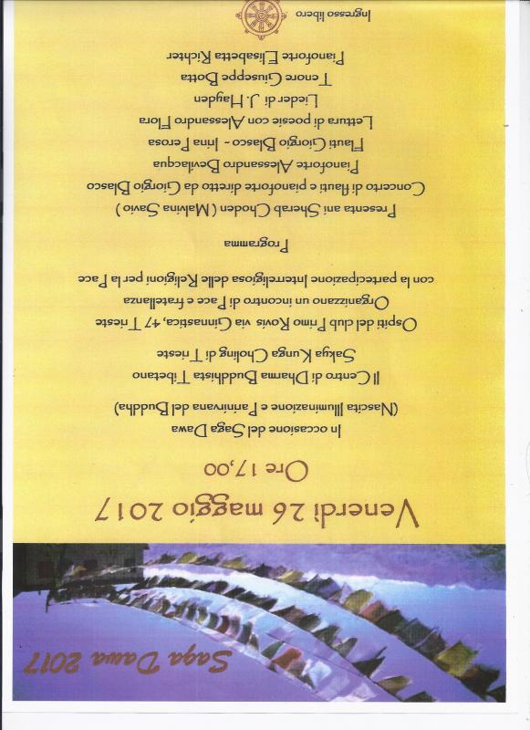 Venerdì 26 maggio alle ore 17.00 al Centro di Dharma Buddhista Tibetano Sakya Kunga Choling di Trieste, in occasione del Saga Dawa, si terrà un incontro di Pace e fratellanza con la partecipazione interreligiosa delle religioni per la Pace. A presentare l’evento: Sherab Choden (Malvina Savio). Un pomeriggio di parole con la lettura di poesie da parte di Alessandro Flora, e di musica con i pianisti Alessandro Bevilacqua e Elisabetta Richter, i flautisti Irina Perosa e Giorgio Blasco e il tenore Giuseppe Botta. Ingresso libero