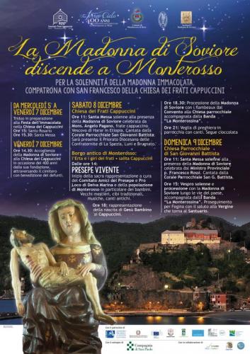 In occasione dei 400 anni dalla fondazione del Convento dei Frati Cappuccini di Monterosso al Mare sabato 8 dicembre 2018 si celebra la Festa della Madonna Immacolata - compatrona con San Francesco della Chiesa Convento - riportando l’antica tradizione di un tempo quando si saliva ai Cappuccini per la novena sia dal paese che dai monti dopo aver camminato tutta la notte. Per solennizzare l’occasione, la statua della Madonna del Santuario di Soviore sarà condotta dalle alture del Santuario fino a Monterosso, in via del tutto eccezionale, dapprima al Convento dei Cappuccini, poi lungo le vie del paese in festa per raggiungere la Parrocchia di San Giovanni Battista. La Madonna, molto venerata nel territorio, è patrona della Diocesi di La Spezia-Sarzana-Brugnato e si trova nel Santuario mariano più antico della Liguria.