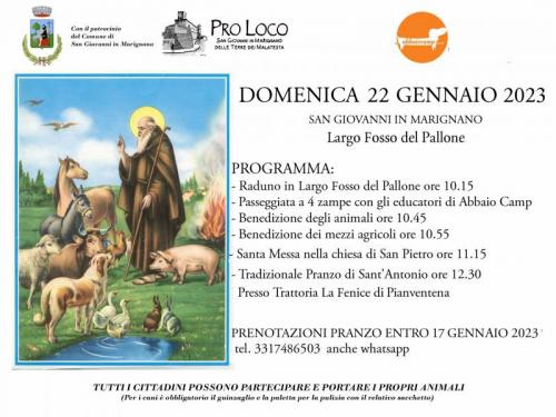 Anche a San Giovanni da tantissimi anni viene celebrata questa ricorrenza con una benedizione in Piazza, iniziativa promossa da Pro Loco di San Giovanni in Marignano aps in collaborazione con il Comune, la Parrocchia di San Pietro Apostolo e la partecipazione di Abbaio Camp, scuola di formazione cinofila.
