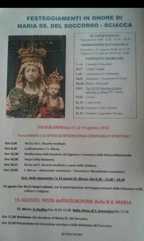 Tra le tradizioni popolari che hanno luogo a Sciacca, sicuramente la più importante e la più sentita dalla cittadinanza tutta, perfino dai Saccensi che per un motivo o per un altro hanno dovuto lasciare Sciacca emigrando all'estero è la festa in onore della Madonna del Soccorso patrona della città di Sciacca.
