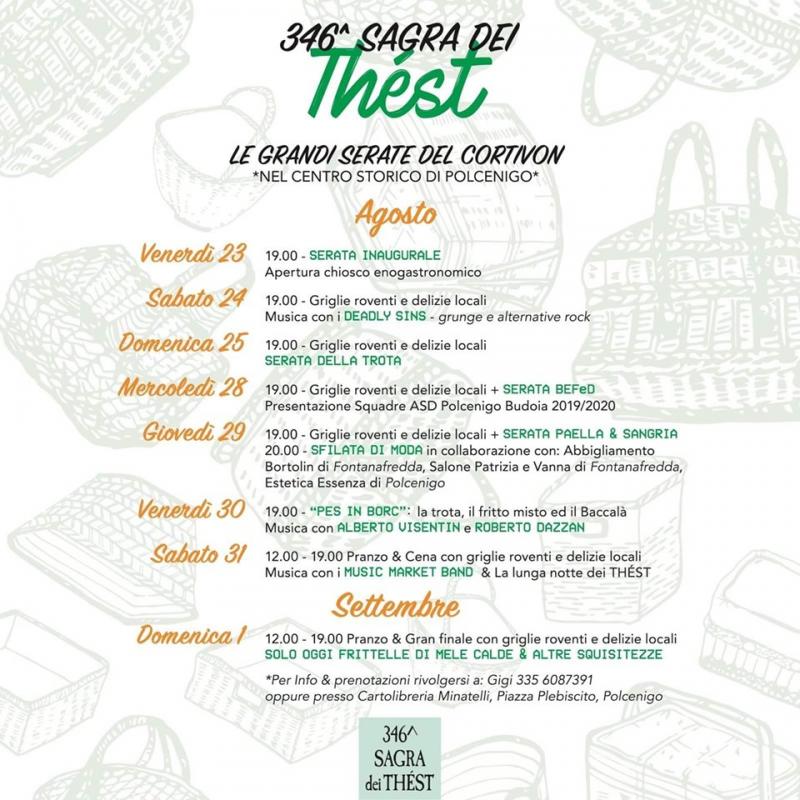 A Polcenigo da più di trecento anni, il primo fine settimana di settembre si svolge la 'Sagra dei Sest'(o Thest = cesti), una fiera dove i contadini si recavano per acquistare i recipienti per la vendemmia.