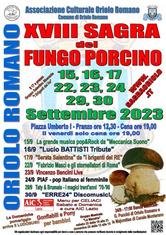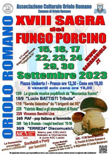 La 16^ Sagra del Fungo Porcino a Oriolo Romano si svolge dal 15 al 17 e dal 22 al 24 e 29, 30 Settembre 2023.