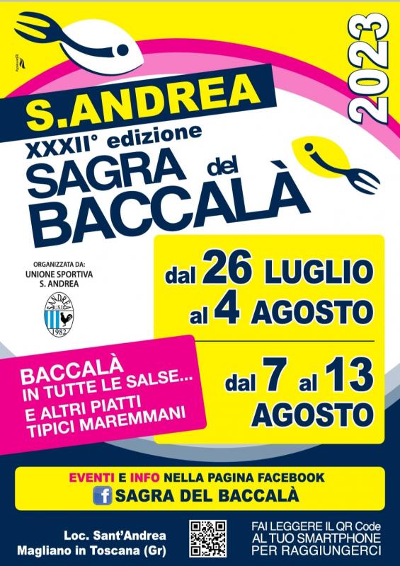 Dal 26 Luglio al 4 Agosto e poi dal 7 al 13 Agosto 2023 si svolge la 32a edizione della Sagra del Baccalà di Sant'Andrea, frazione di Magliano in Toscana (GR).