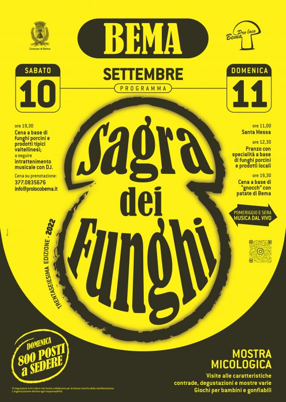 10 e 11 settembre 2022 torna a Bema la Sagra dei Funghi, che anche quest’anno propone il doppio appuntamento dedicato al fungo porcino e ai prodotti tipici della Valtellina.