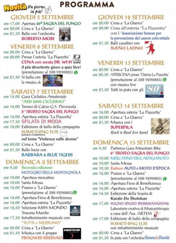 Torna il tradizionale appuntamento con la Sagra del Fungo di Pievescola, frazione di Casole d'Elsa, che si svolge nei giorni: 5, 6, 7, 8, 12, 13, 14, 15 Settembre 2019.