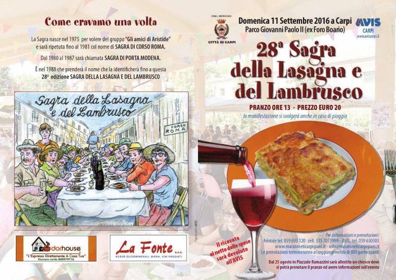 La 28^ edizione della Sagra della Lasagna e del Lambrusco si svolge domenica 11 settembre presso il Parco Papa Giovanni Paolo II (ex Foro Boario) a Carpi.