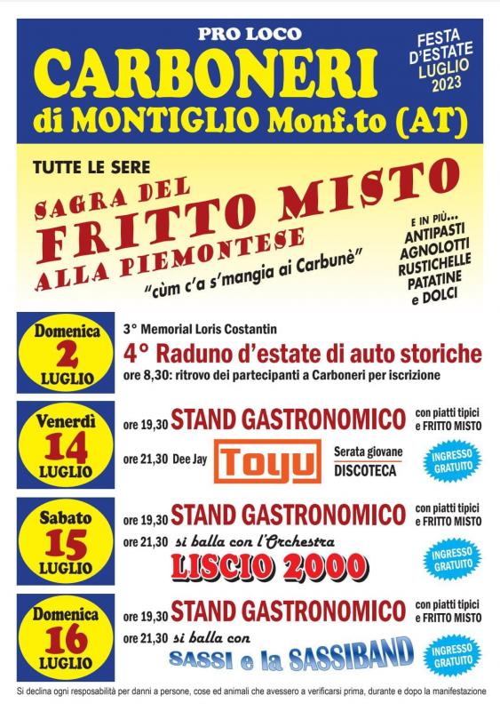 Torna dal 14 al 16 luglio 2023 a Carboneri di Montiglio Monferrato la Sagra Del Fritto Misto Alla Piemontese.