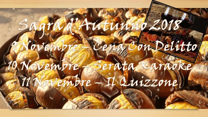 Si inizia con venerdì 9 novembre con la cena con dellito, sabato si prosegue con la serata karaoke, mentre domenica la sagra chiude con il quizzone.