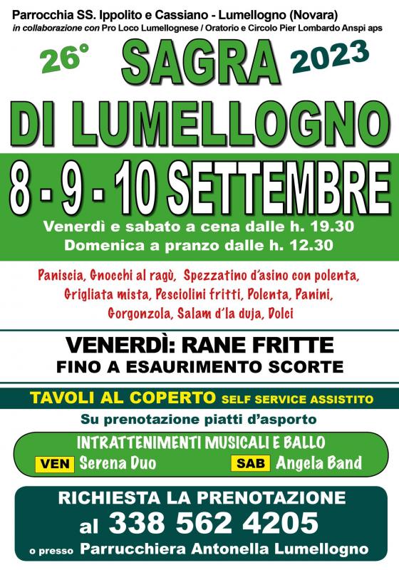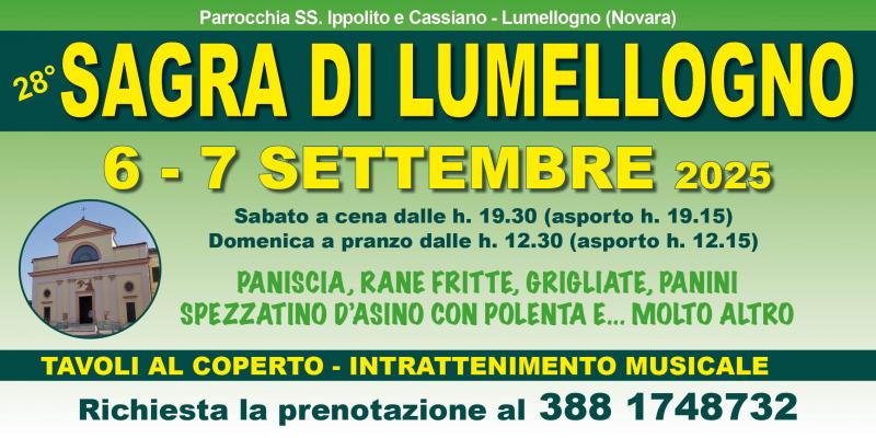 Sabato 6 settembre 2025 a cena e domenica 7 settembre 2025 a pranzo, nel cortile parrocchiale in Vicolo Canonica di Lumellogno, sarà possibile gustare le rinomate specialità preparate dai volontari tra cui: paniscia, rane fritte, spezzatino d'asino con polenta, grigliata mista, panini, gorgonzola e salami, dolci. I tavoli sono tutti al coperto, con servizio self-service con assistenza di camerieri.