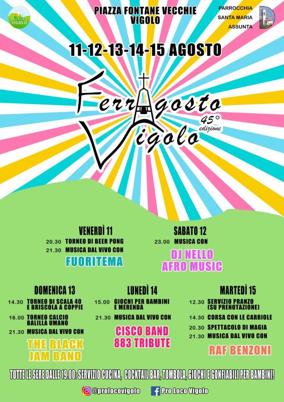 La Parrocchia Santa Maria Assunta e la Pro Loco Vigolo vi aspettano da lunedì 11 a martedì 15 agosto per la tradizionale sagra di Ferragosto! 5 giorni di giochi, divertimenti, musica e buon cibo. Tutte le sere dalle 19.00 sarà attivo il servizio cucina e bar e a seguire musica, tombola, giochi e gonfiabili per bambini.