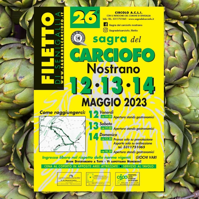 La 25a edizione della Sagra del Carciofo Nostrano a Filetto di Senigallia (AN) si svolge il 12-13-14 Maggio 2023.