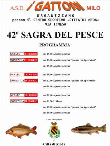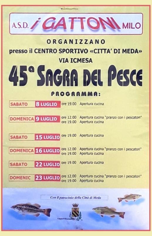 Si rinnova l’appuntamento con la Sagra del Pesce a Meda dal 8 al 9 e Sabato 15 e domenica 16 e Sabato 22 e domenica 23 Luglio 2023 giunta alla 45^ edizione organizzata dalla società sportiva I Gattoni – Milo presso il Centro Sportivo Comunale Città di Meda via Icmesa.