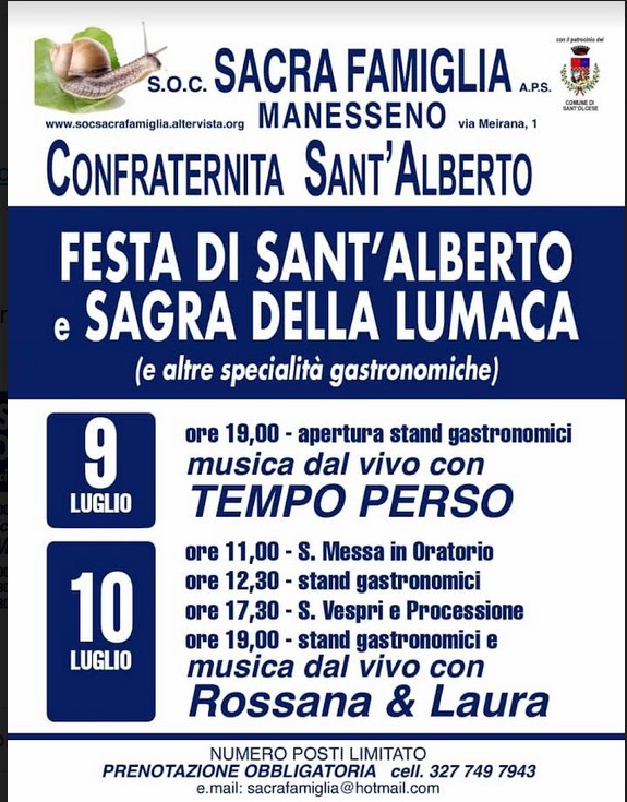 Ritorna la consueta Sagra della Lumaca in occasione della Festa Patronale di Sant'Alberto il 12 e 13 Luglio 2025