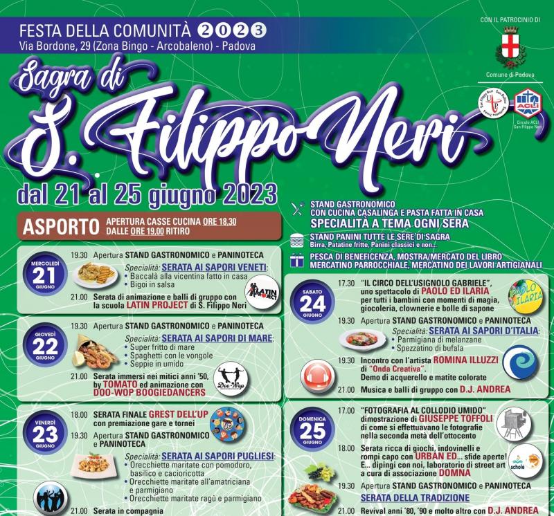 Sagra di san Filppo Neri a Padova dal 21 al 25 giugno 2023 , in via Bordone 29 Arcella (zona Stadio Atletica - Parco Morandi) stand gastronomici aperti dalle 19:30 con possibilita anche di asporto , cucina casalinga con specialita a tema ogni sera , mercatno parrocchiale e mostra mercato del libro, mercatino lavori artigianali, pesca di beneficenza,
