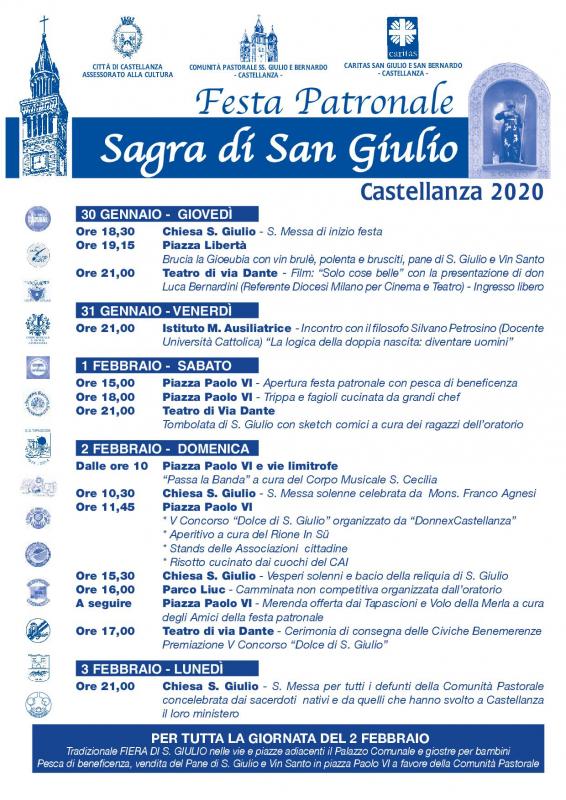 La sagra - organizzata dall’Assessorato alla Cultura della Città di Castellanza in collaborazione con la Comunità Pastorale di San Giulio e San Bernardo e con la Caritas di Castellanza, con il supporto delle associazioni cittadine - prenderà il via GIOVEDÌ 30 GENNAIO alle ore 18.30 nella Chiesa di San Giulio con la S. Messa; dopo la funzione religiosa che segna l’inizio ufficiale della festa, in Piazza Paolo VI, in piazza Libertà BRUCIA LA GIEUBIA con vin brulè, polenta e brusciti, pane di San Giulio e Vin Santo. Alle ore 21.00 al Teatro di Via Dante Fil: “Solo cose belle” con la presentazione di don Luca Bernardini (Referente Diocesi Milano per Cinema e Teatro) – ingresso libero.