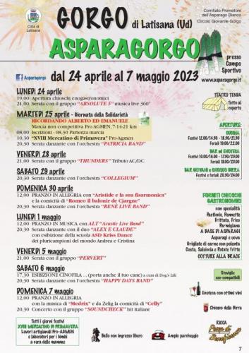 La Sagra degli asparagi a Gorgo di Latisana (UD) asparagorgo si svolge nei giorni: 25, 26, 27, 28 Aprile e 01, 03, 04, 05 Maggio 2024.