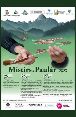 Mistîrs, il viaggio nella cultura di Paularo tra vecchi mestieri e antiche tradizioni, è divenuto ormai un appuntamento irrinunciabile per quanti desiderano immergersi per una giornata nella vita di un tempo, riscoprendone la genuinità e la semplicità. Nell’ultimo fine settimana di agosto la Valle d’Incarojo si popola di boscaioli e intagliatori, pastori e casari, fabbri e arrotini, muratori e falegnami, i quali, con il loro ingegno, animano le vie e le piazze del paese incantando grandi e piccini.