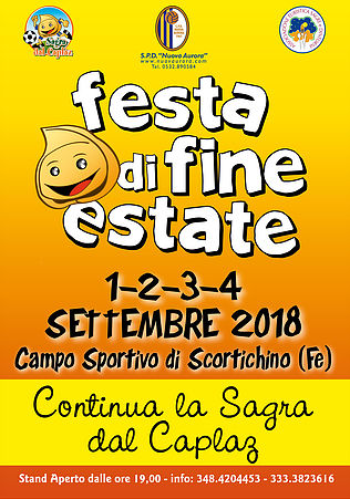 La Nuova Aurora SPD vi aspetta alla Festa Di Fine Estate dall'1 al 4 settembre 2018 presso lo stadio comunale "Gino Masi" di Scortichino (Fe) - Via provinciale 129/H.