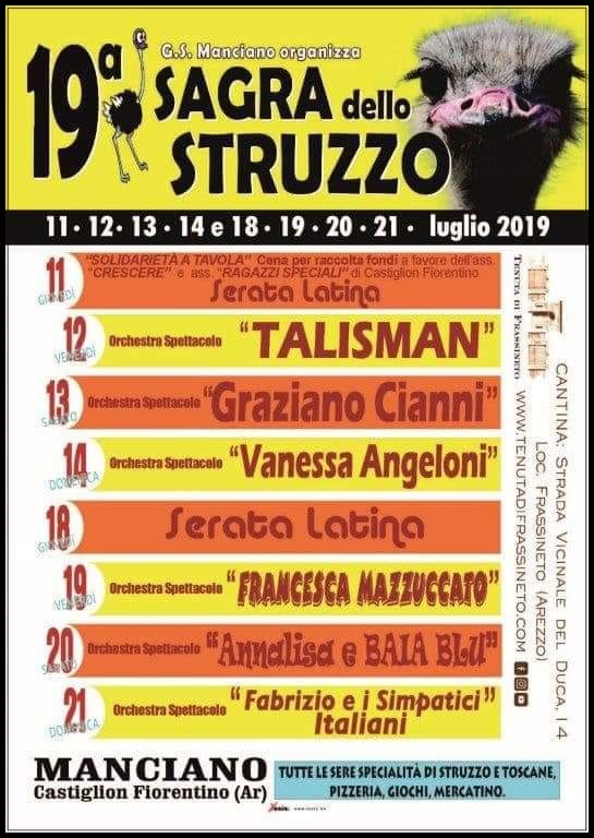 Il G.S. Manciano organizza la 19ª SAGRA DELLO STRUZZO nei giorni 11, 12, 13, 14, 18, 19, 20, 21 Luglio 2019 a Manciano (AR).