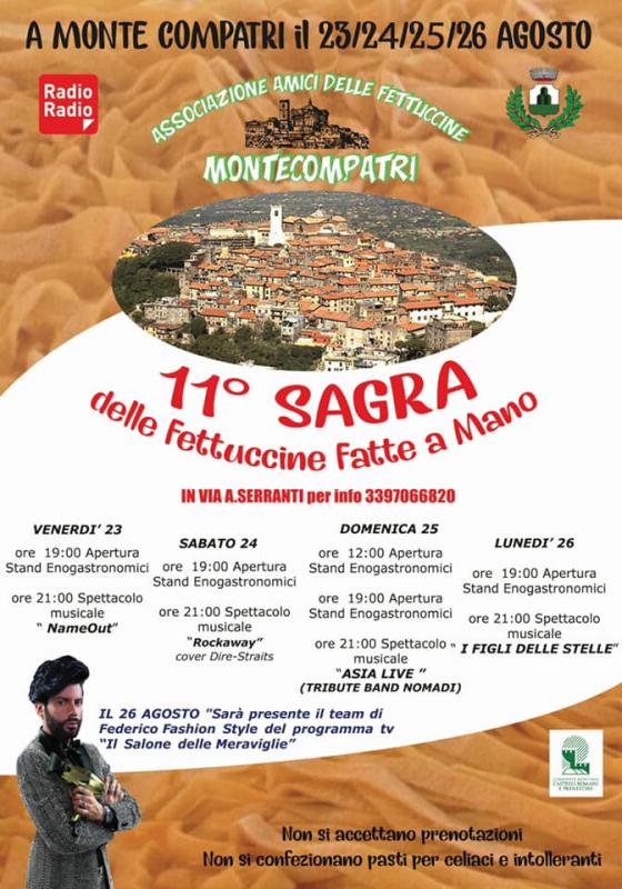 L'evento si tiene ogni anno in uno dei borghi più belli dei castelli romani, allietati dalla musica, dal panorama e da un clima gradevole potrete degustare le fettuccine fatte a mano dalle signore di Monte Compatri con il sugo al ragù e con i funghi porcini, trovate circa 1200 posti a sedere e un mercatino di prodotti tipici.