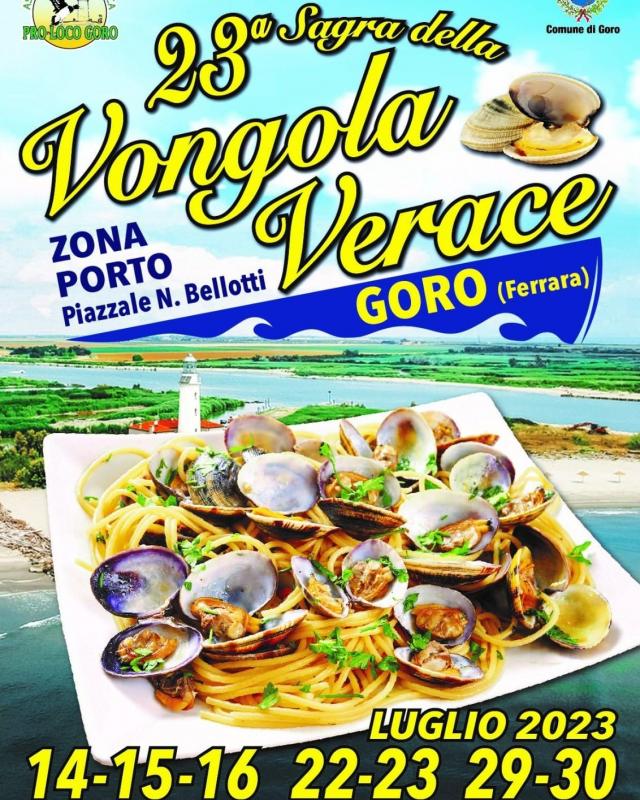 Presso la Zona Porto di Goro in provincia di Ferrara si svolge nei giorni dal 14, 15, 16 - 22-23 - 29- 30 Luglio 2023 la 23a edizione della Sagra della Vongola Verace.