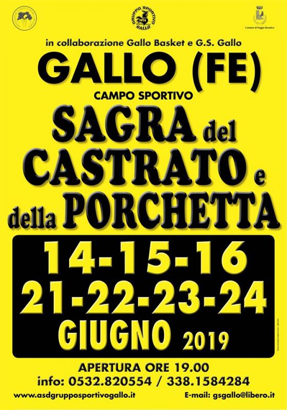 La Sagra del Castrato e della Porchetta di Gallo (Fe) si svolge nei giorni 14, 15 16, 21, 22, 23 24 giugno 2019 presso il ristorante tenda al Campo Sportivo.