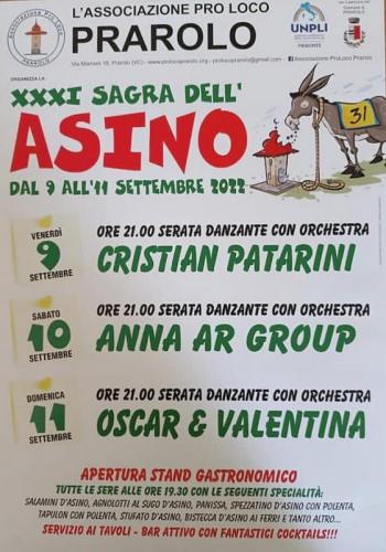 La Pro Loco anche quest'anno organizza la Sagra dell'Asino (Sagra dl'Asu) a Prarolo che si svolge dal 9 all'11 settembre 2022.
